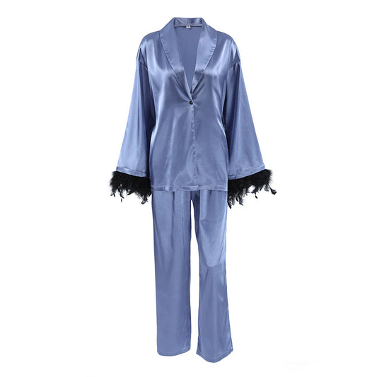 Satin Pajamas Long Sleeve Feather Cardigan Two-piece Set