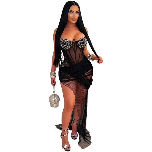 Women's Wear Sexy Mesh Rhinestone Sling Dress