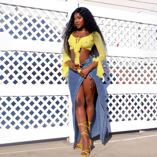 Beaded Sequins And Fringed Denim Bust Women's Irregular Fringe High Slit Exposed Legs And Hip Skirt