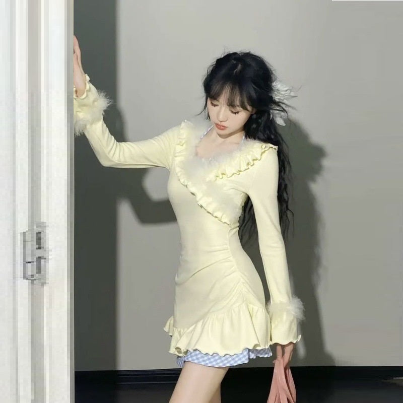 Pure Desire Style Sweet Dress Spring And Autumn Ruffled Waist-tight Slimming Sense Of Design V-neck Patchwork Fake Two Pieces