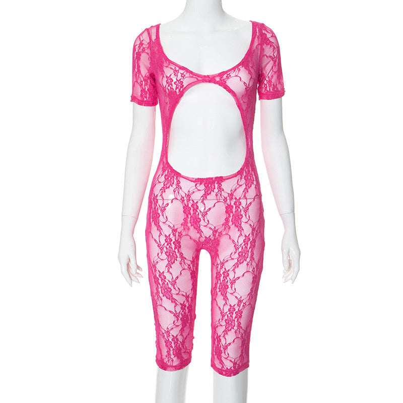 Women's Sexy Lace Stitching U-neck Short-sleeved Cropped Hollow Siamese Shorts