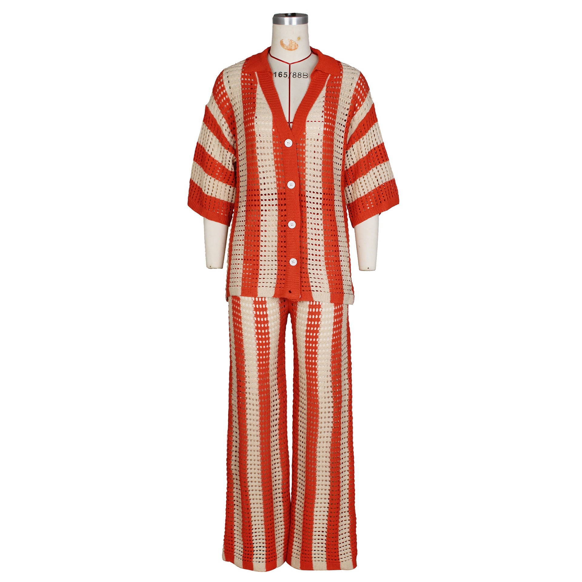 Women's Sexy V-neck Hollow Striped Lapel Knitted Width Blouse And Pants